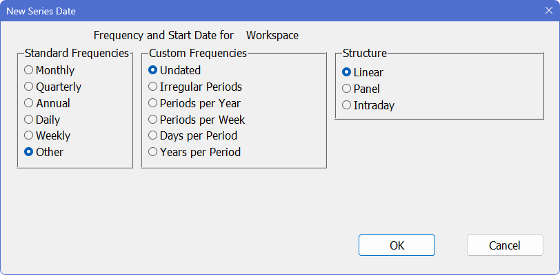 To work with time series data, we first want to tell RATS the frequency and starting date for our data set. One way to do that is to use the Calendar Wizard. Select the the Data/Graphics>Calendar operation. RATS will display the Calendar Wizard dialog box shown below, which allows you to set frequency and date information. The most common frequencies are in the “Standard Frequencies” group.