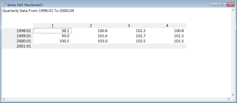 If you do the menu operation View>Series Window, you will now see a Series Window listing all the series in memory. We’ll talk more about this when we have more data. For now, this should just have one line for the series QUARTER. At this point, we have saved the data out of the Series Edit Window into a RATS series. If you need a permanent copy, you need to take one more step: exporting the data to a file, which can be done with File>Export or File>Save As.