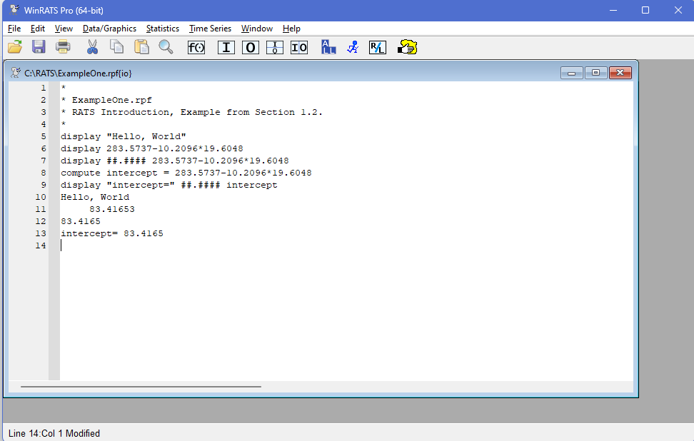 When a text window is active, the status bar at the bottom of the application will show the current cursor position (here line 14, column 1) and whether or not the information has been modified since the window was opened (here, it has).