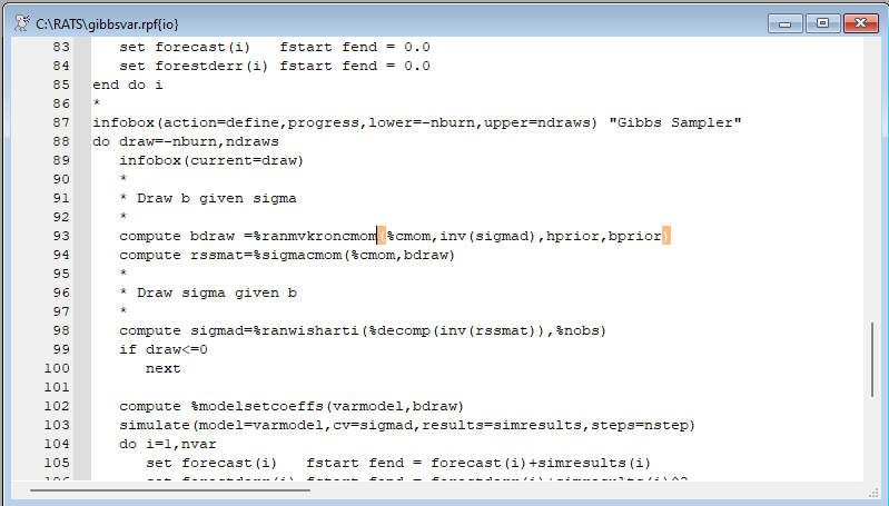 Text windows are your primary means of interacting with the RATS program. In interactive mode, they are used to hold both the input (instructions or programs that you want to execute) and most of the output (displaying of results). Even the Wizards operate by writing instructions into a text window so you can reproduce the results later without going through the dialogs again.