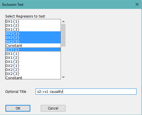 These next lines do causality tests in the mean. The first does a joint test for whether the dx2 lags and the ect lag are zero in the first equation (first block of mean model coefficients) and the second does a similar test for the dx1 lags and ect in the second block of mean model coefficients. The simplest way to set these up is to use the Regression Tests, Exclusion Restrictions test wizard. Note that the Pardo-Torro paper doesn't include the lagged ECT in the test, but it should be included since if it's non-zero, the lagged "other" does help to predict. The wizard dialog for the x2 to x1 causality will look something like