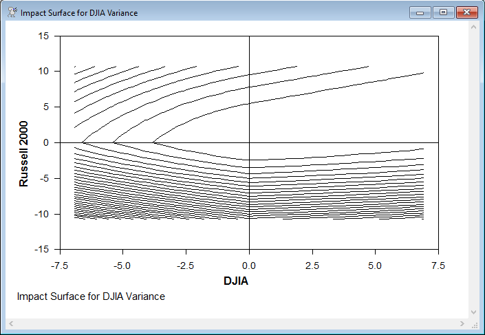 One of the news impact surfaces, graphed as a contour graph for the impact versus the shocks in the two variables. Even though this is for the variance of the DJIA, it is most heavily impacted by the negative lagged shocks in the Russell 2000 (the contours are steepest in the negative Y direction).